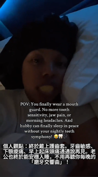 晚上戴 Reviv 護齒套睡覺真的有差。我的磨牙情況少很多,起床時也不再有以前那種下巴緊繃感。最讓我意外的是,早上精神明顯好很多、整個人放鬆不少,能更加輕鬆地度過一整天。