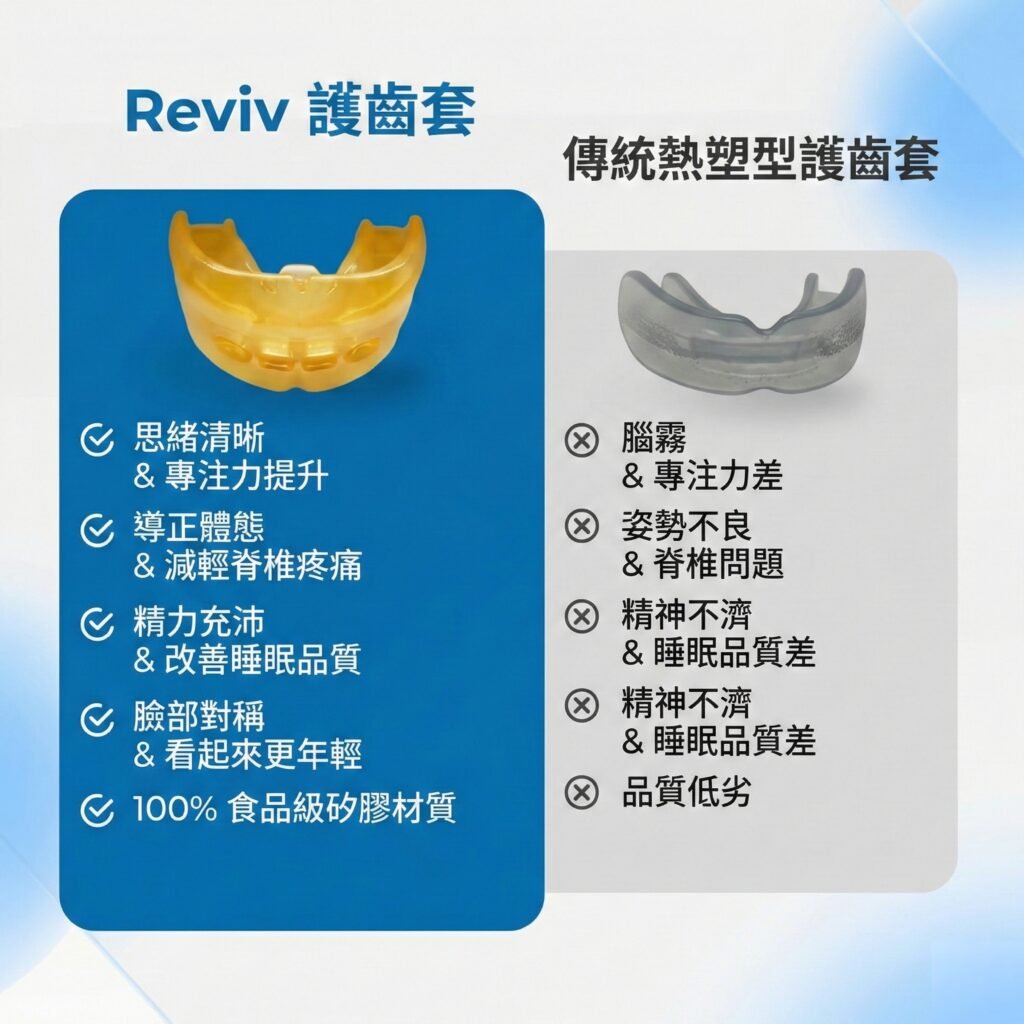 每一款 Reviv 口腔護具都以高精密製程打造,使用食品級矽膠製作,設計目的在於降低夜間咬緊牙關、舒緩下顎緊繃,並讓睡眠品質更加穩定。無論你是運動員、磨牙族,或只是想要提升恢復狀態,都能找到最適合你的一款。