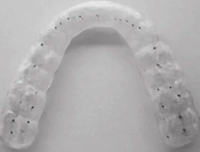 我會用一個「追蹤牙托」來觀察咬合的變化(這個概念我以前解釋過):基本上,在做身體調整之前,我會先把追蹤牙托上後面四顆牙的咬合接觸點磨到均勻。等到身體調整結束後,我就會看到這些接觸點的位置發生了改變。