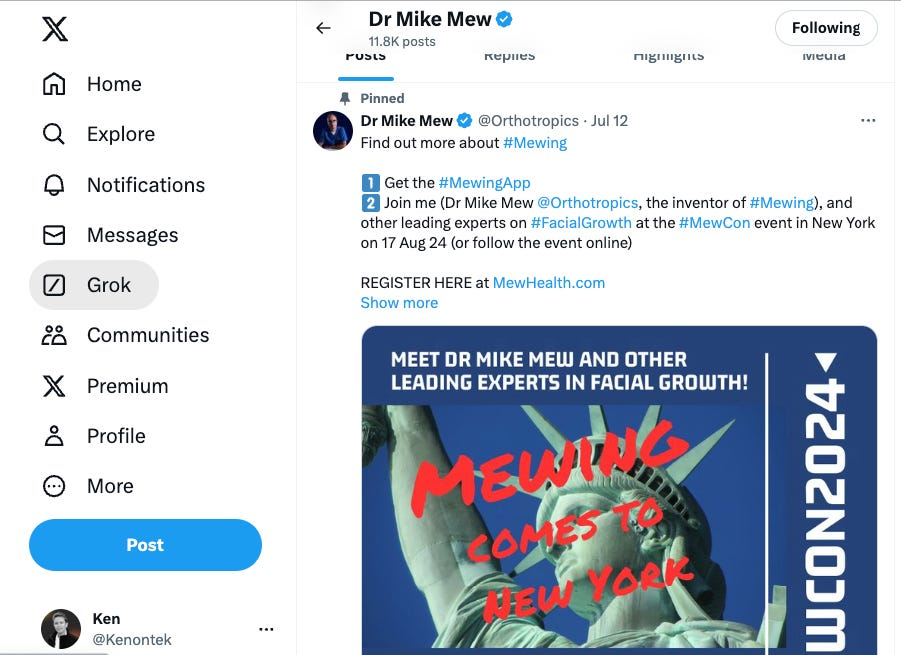 所以我會把許多人白白浪費時間在這套無用練習上的原因部分歸咎於 Mew 氏父子。現在可能有成千上萬的人投入了這種完全沒效果的練習,而且圍繞這個話題還衍生出許多投機的騙局。我認為這些亂象,他們難辭其咎。