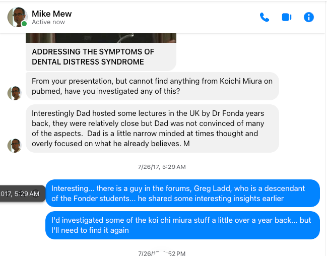 值得一提的是,早在 2015 年我就已經留意到 Mike Mew 這號人物。當時我正在實踐 Starecta 方法,而 Starecta 的創始人還特地前往倫敦拜訪過 Mike,與他交流知識。2017 年時,我也曾和 Mike 在 Facebook Messenger 上聊過幾次(我還保留了其中一段對話截圖)。