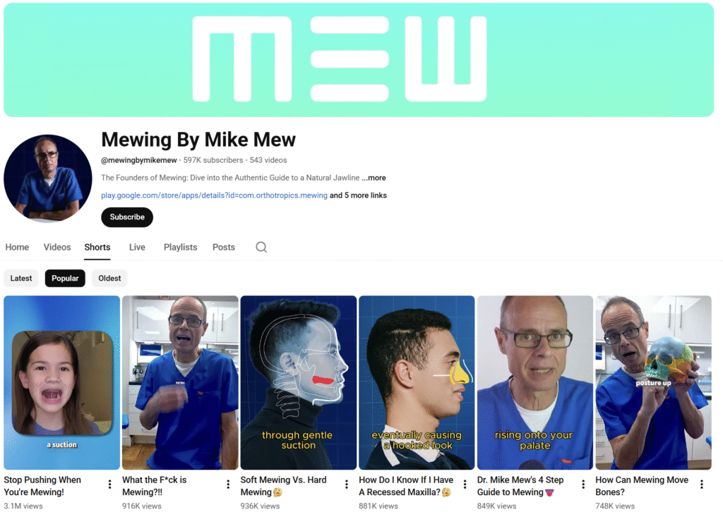 約翰·繆(John Mew)和麥可·繆(Mike Mew)是一對英國的牙醫父子檔。早在 1960 年代,約翰創立了「Orthotropics 正向生長矯正」——這是齒顎矯正學的一個分支,強調透過非拔牙的治療方法和肌肉訓練來引導臉部正確生長發育。他的方法聚焦於矯正口腔姿勢、指導臉部發育,以期達到理想的牙齒排列和臉部外觀。他也公開抨擊傳統的矯正療法,點燃了反對既有矯正體系的火炬,因而招致牙醫界權威人士的不滿和壓力。