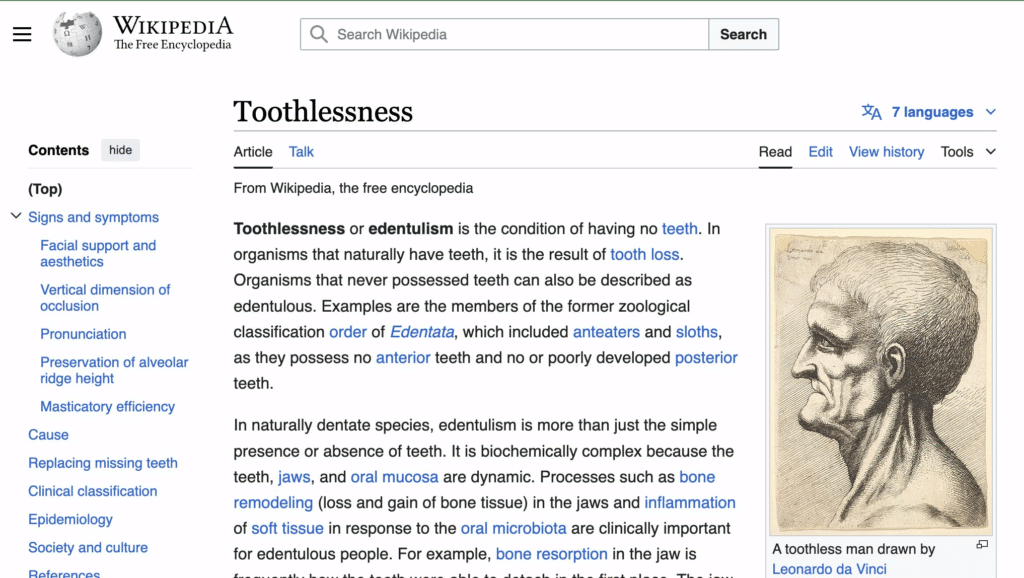 簡單來說,牙齒矯正本質上就是把你的牙齒位置移來移去。然而問題在於:牙齒對於口腔乃至整個頭骨而言,就像建築物裡的結構支柱。你可以去維基百科搜尋「toothlessness」(無牙),在這個舉世公認的資訊來源上白紙黑字地寫著:當一個人拔掉全部牙齒之後,頭骨和臉會發生什麼樣的變化。維基百科上還附了一張圖片,請留意圖片中那個人臉部肌肉組織和頸椎的變化。