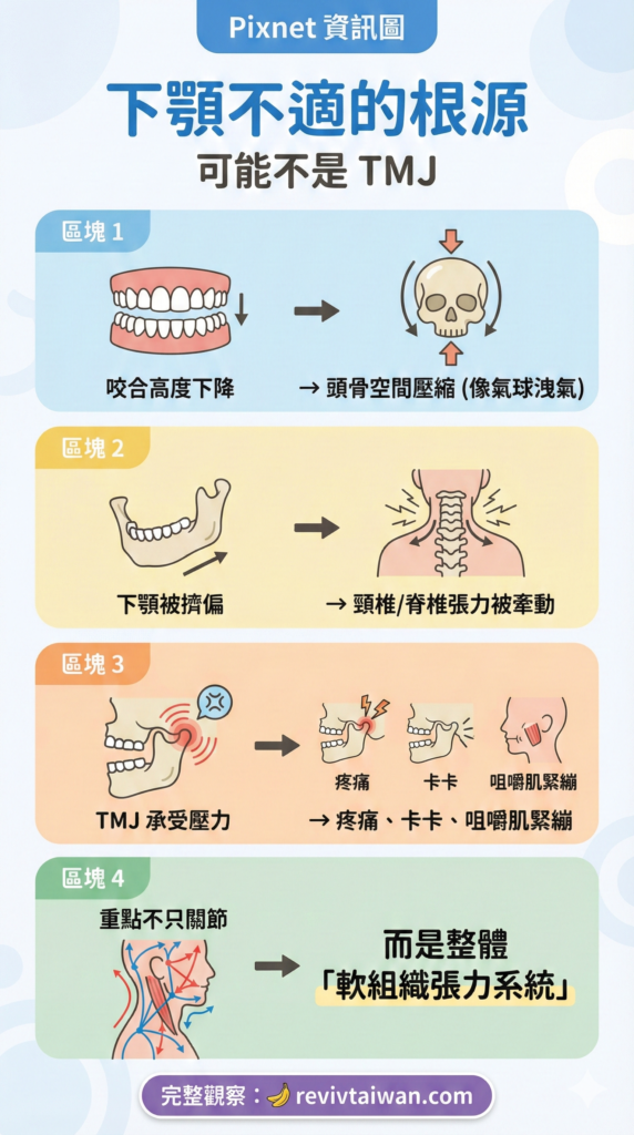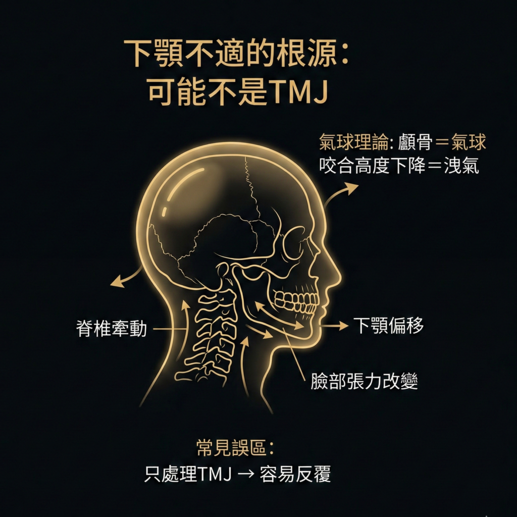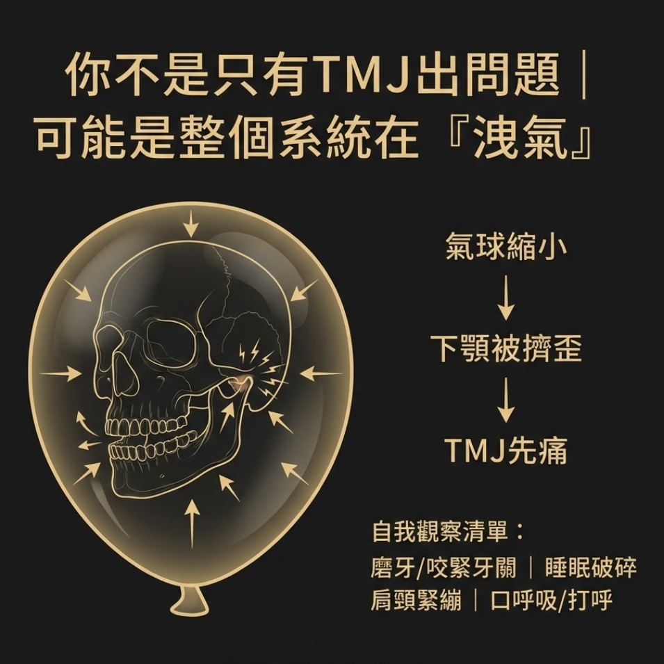 可以這麼想:你的頭骨和下顎骨就好比被放在一個氣球裡的兩塊硬物,中間靠軟組織連接著。當我們從這個氣球(也就是頭部的軟組織)放掉空氣時,按照物理常識,你覺得會發生什麼事?很簡單嘛——隨著氣球縮小,你的下顎骨當然會被擠得扭到其他位置。既然下顎連接頭骨的地方正是 TMJ 關節,那這個關節肯定也跟著遭殃。
