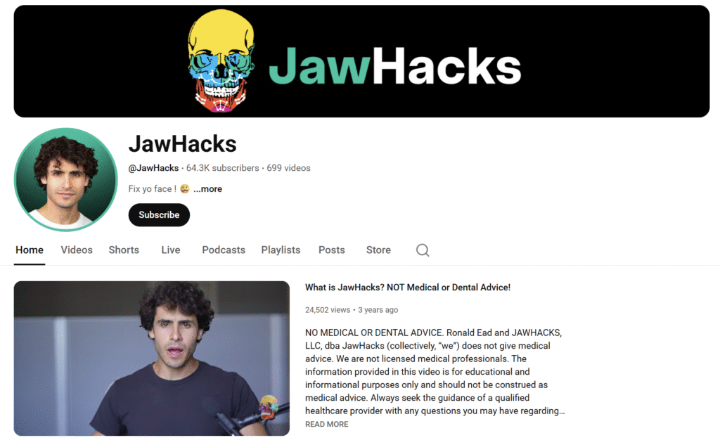 總之,當我最近再次看到 Ronald 這個名字時,他讓我刮目相看。因為在不久之前,我在 YouTube 上無意間發現一個名為 JawHacks 的頻道——在如此冷門的主題領域竟然有高達 6.4 萬的訂閱者,這相當驚人——後來才發現那就是 Ronald 自己的頻道。我得說,他在 YouTube 上還真有一套。