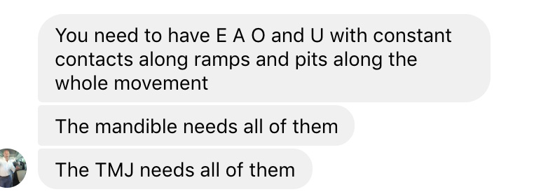 簡而言之,他認為一個健康運作的口腔需要具備四種不同的咬合位置。他當時傳給我一段訊息,大致內容是: