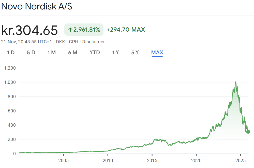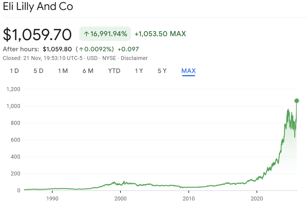 Ozempic 背後的丹麥製藥巨頭諾和諾德(Novo Nordisk),市值一路飆升至超過 4,000 億美金 (現在已降回 2,000 億美金),成為目前歐洲市值最高的公司。而 Mounjaro 背後的美國製藥大廠禮來 (Eli Lilly),市值甚至逼近 1 兆美金,他們的股價僅在過去一兩年內就翻了一倍,驅動力正是其王牌藥物 Ozempic 和 Mounjaro 的驚人需求。Ozempic 和 Mounjaro 每位患者每月花費約 1,000 美金,據估計全美有超過一千萬人想嘗試這種治療。諾和諾德和禮來等於是在美國對抗肥胖的戰爭中挖到了一座金礦。