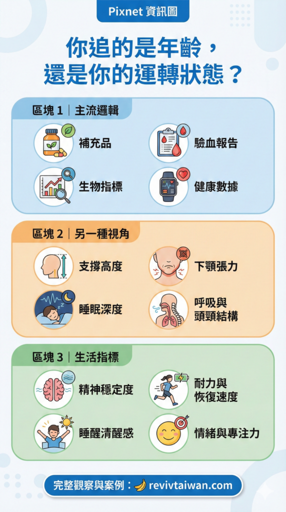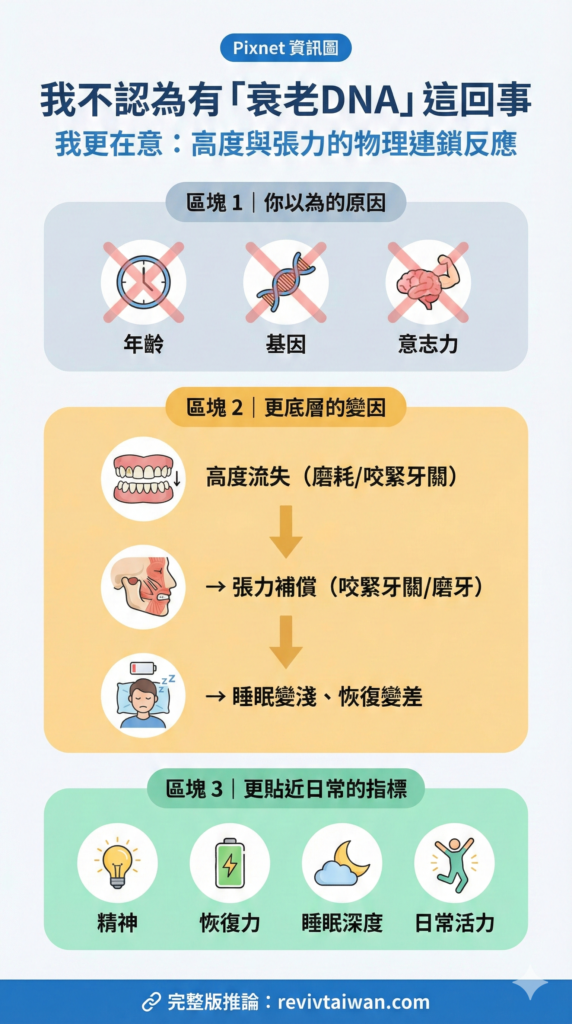以上這篇文章,是由 Reviv 創辦人 Ken 基於他的親身經驗所撰寫的觀點分享。看到他敢於挑戰傳統醫學觀念、並用多次自我實驗來證明逆轉衰老的可能性,我們作為 Reviv 在台灣的合作夥伴也深受啟發與鼓舞。Ken 強調牙齒和頭部軟組織對全身生物力學的深遠影響,而我們也相信牙齒的健康確實不容小覷。