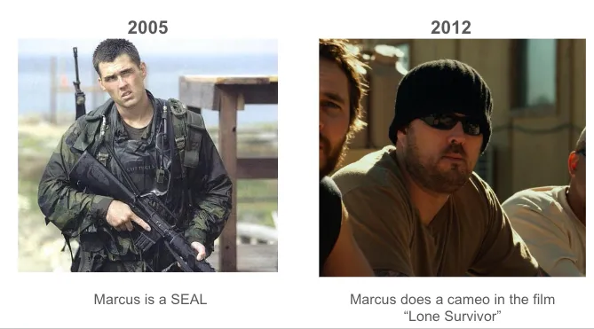 在 2005 到 2012 年之間發生了什麼事?嗯,他那七年一直是海豹突擊隊員……而海豹部隊每天都要進行大量高強度的體能訓練。這是不是一個完美無缺的例證?當然不是。不過請注意,我觀察並追蹤這種模式已經超過五年了,每當看到新的例子出現,我都會設法去推翻自己的論點,看看是否有例外。