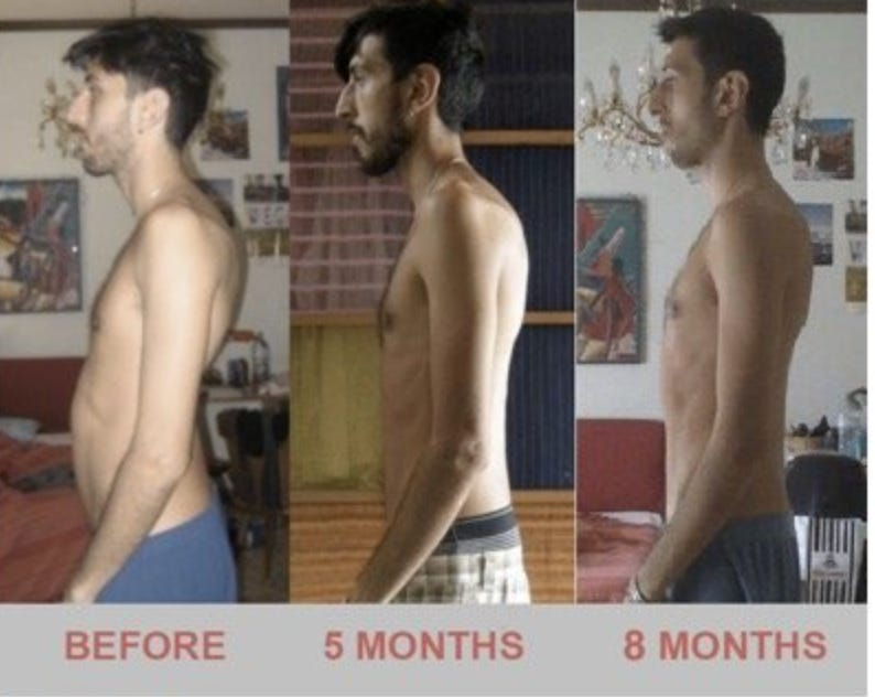 終於,在某個時間點,我成功將頭部的軟組織拉伸到了極致。結果,我的下顎自然而然地移動到了正確的解剖位置,而我整條脊椎也隨之「喀啦、喀啦、喀啦」地一路校正了回來。就在那短暫的期間,我感覺棒極了,整個人的精神狀態和外表看起來都好到不可思議——甚至可以說,比我之前人生中的任何時刻都還要來得更好。