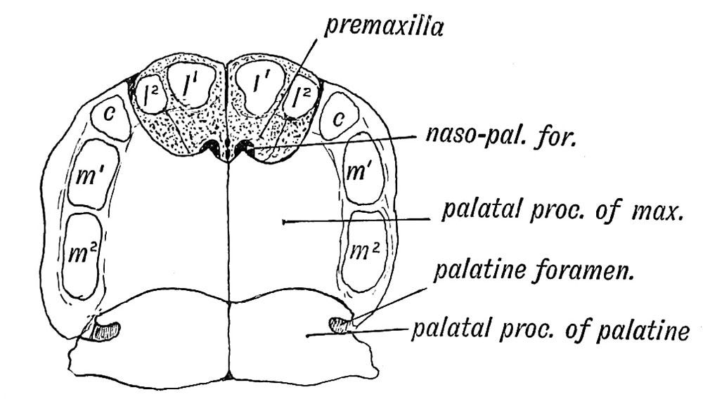 據說人的上顎骨由幾塊骨頭組成,中間的連接處就是顱骨的縫合線。我們張嘴把拇指頂在上顎內側往外撐,理論上就是想稍微拉開這些縫合線、刺激上顎向外擴張。如下面這張上顎骨解剖圖所示,各塊顎骨間的線條就是縫合線(suture),這正是 thumbpulling 想作用的目標部位。