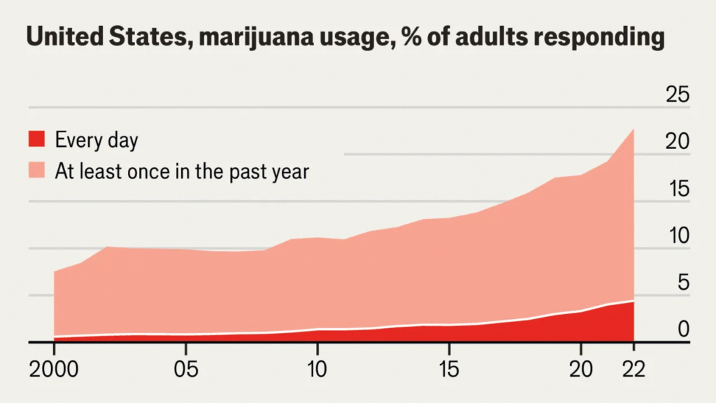 從數據來看,大麻使用率的飆升和其他一些令人擔憂的趨勢幾乎是同步發生的——例如牙齒矯正的人數不斷增加、肥胖率攀升、神經系統疾病和注意力缺陷過動症(ADHD)的病例越來越多,等等。這絕非巧合。隨著陷入這種結構塌陷惡性循環的人比例越來越高……人們開始把吸大麻當成一種紓解身心的手段。無法透過自然方式放鬆,他們只好求助於化學物質的輔助。