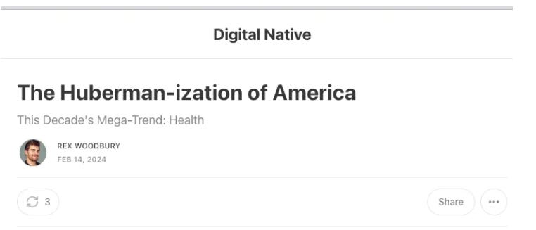 基本上,Rex 的看法是:休伯曼(Huberman)的崛起象徵著更廣泛的巨大轉變——整個社會越來越重視健康。我們對自己的身體和大腦比以前關心得多,因此也更願意花錢確保它們狀態良好。