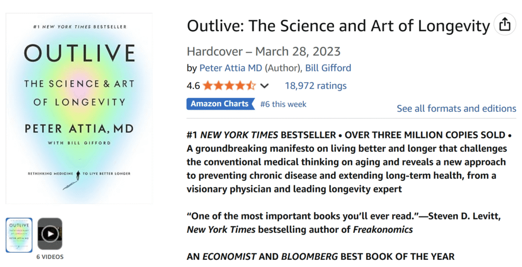 艾提亞也出版了一本名為《Outlive:長壽的科學與藝術》的書,這本書在 Amazon 上有超過1.65萬則評論,是長壽主題的暢銷書。