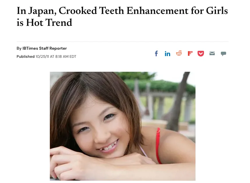 幾個月前我去日本時,又讓我想起了這點。儘管日本是一個富裕的國家,但牙齒矯正在那裡並沒有像其他已開發國家那樣普及。牙齒長得不整齊在日本社會是可以被接受的,大家也沒有所謂非得「矯正」不可的壓力。事實上,日本甚至還出現過這樣的趨勢:有些女孩特意保留甚至強調自己牙齒的不完美(比如故意留著虎牙),哈哈,這種事恐怕只有在日本才看得到!