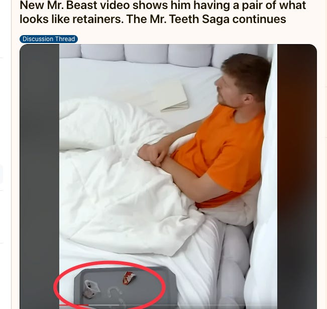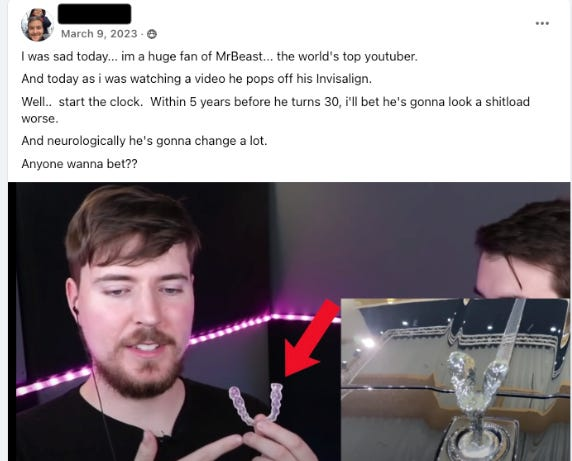 我記得看過他 2021 年拍的一支影片,他在鏡頭前取下隱形牙套,提到自己正在做牙齒矯正。我心裡立刻冒出一個念頭:『完蛋了……MrBeast 要開始走下坡了。』當下我甚至跑到自己經營的一個顳顎關節討論的小型臉書社團發帖,聲稱我「預見」了他的下滑。這也算留下個紀錄,以便於日後驗證看看我有沒有說中。