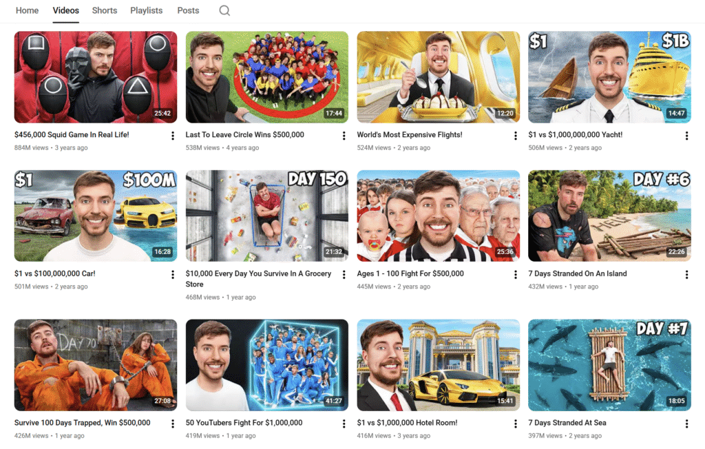 大約四年前,我當時7歲的孩子帶著我一起看 MrBeast 的影片。如果你這幾年都待在山洞裡、可能還不知道:MrBeast 可是全世界排名第一的 YouTuber。光是在 YouTube 上,他各個頻道的訂閱總數就高達約4.49億(此外他也活躍於 TikTok)。他的許多影片觀看次數都破3億次。做個對比……最近一屆超級盃(Super Bowl)的觀眾加起來也不過1.28億人。