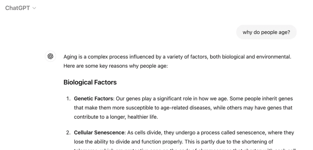 這段對話令我引起了強烈共鳴。因為每當我問 ChatGPT 類似「為什麼人會老化?」「疾病的根本原因是什麼?」「人為什麼會變胖?」這樣的問題時,它總是搬出當今社會深信不疑的那套胡說八道來回答。