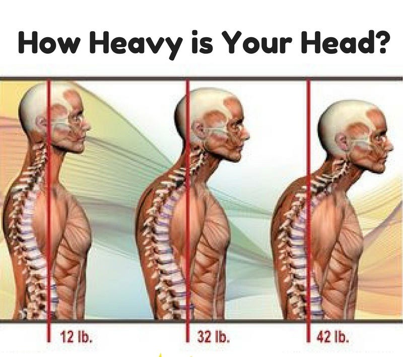 醫療人員常說,頭部每往前移動一吋(約2.54公分),就會對頸椎和脊柱多施加大約 10 磅(約4.5公斤)的壓力。據稱這會導致肌肉緊繃、頭痛以及其他各種問題。