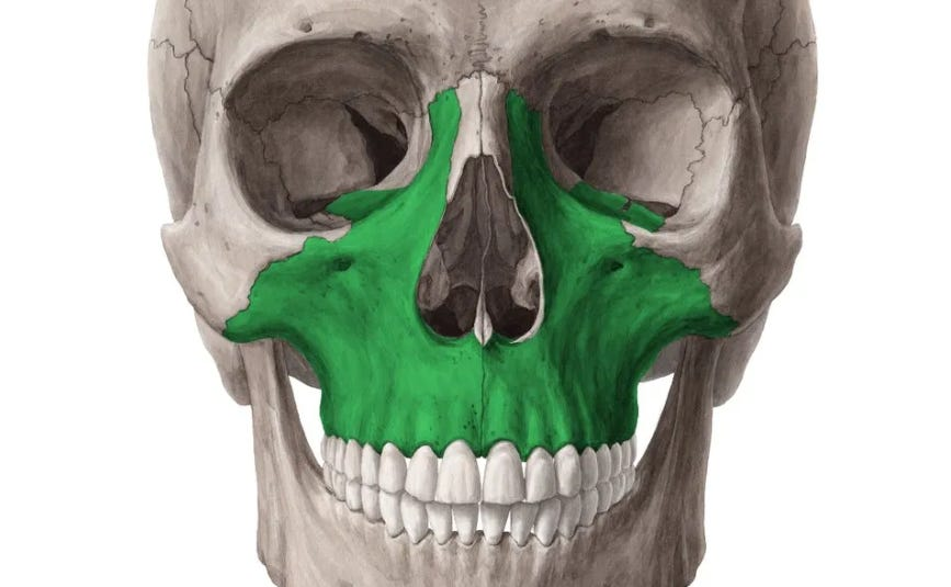 事實上,要讓上顎骨單獨「長出來」或向前移動根本不可能。你大可以拿一個頭骨模型(比如上圖那種我自己從2017年就擁有的模型)擺弄幾個小時試試看,就會明白這道理。光靠上顎骨本身是不可能動起來的;必須是整個頭骨一起改變,因為上顎骨就像頭骨拼圖中的一塊,嚴絲合縫地嵌在裡頭。