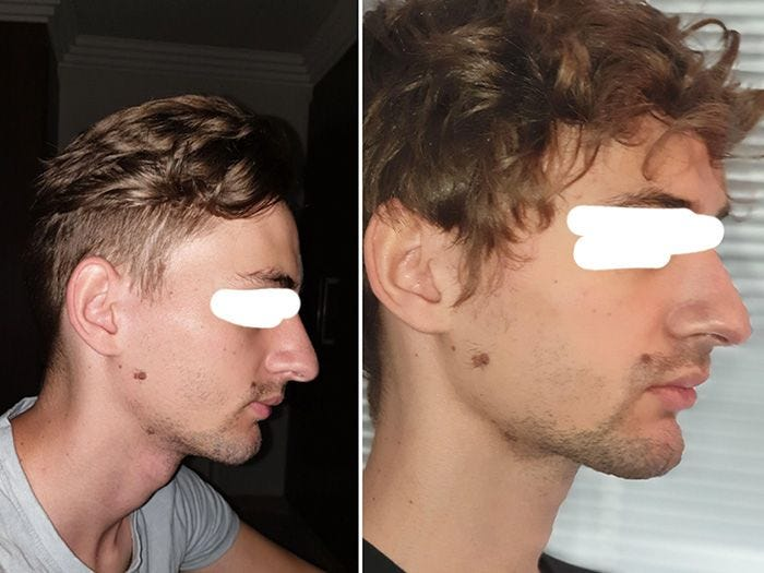 現實裡,我敢說我看過的那些成果裡,有95%根本只是相機角度、光線和脖子姿勢不同造成的錯覺而已。剩下的5%可能真有一些效果,但我猜這些人很可能除了 Mewing 之外,也用了 Myobrace 或平面咬合板之類的輔助。