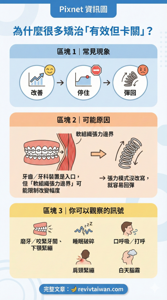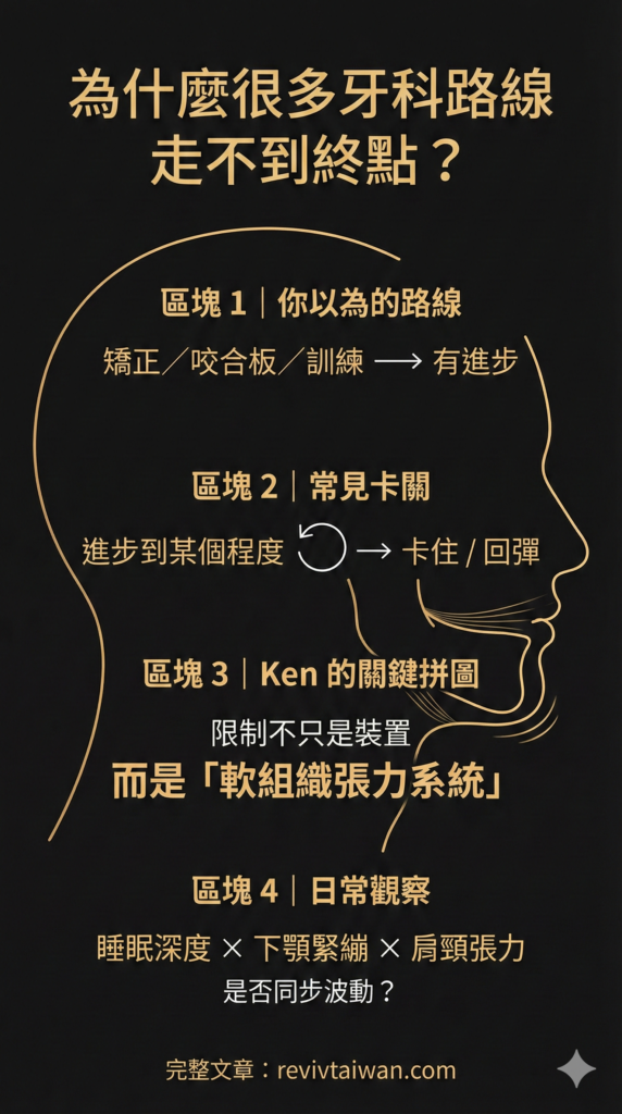 Ken 的個人體驗和大膽觀點聽起來或許令人震撼,但其實點出了非常重要的一點:我們頭部的軟組織與下顎穩定性會深刻影響整個身體的生物力學。這正是我們在台灣推廣 Reviv 夜用護齒套時所強調的核心理念。全球各地(包括台灣)許多使用者的正面回饋讓我們相信,這種看似簡單的居家口腔保健裝置確實能帶來 Ken 所描述的那些積極轉變——從減輕打鼾、磨牙,到改善睡眠品質,甚至緩解長期困擾的肩頸痠痛、背痛和下顎不適。這些真實經驗或許會促使我們重新省思過去對牙齒矯治與身體健康之間關係的既有認知。