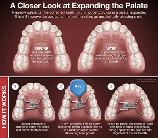 理論上,他們說明擴張器的運作方式如下:裝置通常扣在上顎的幾顆牙齒上,中間有一個螺絲。你每隔幾個月回一次診,醫生就會轉動那個螺絲,把裝置撐得更開。剛調整時常常會疼痛,但過一陣子顎骨和牙齒會稍微適應。