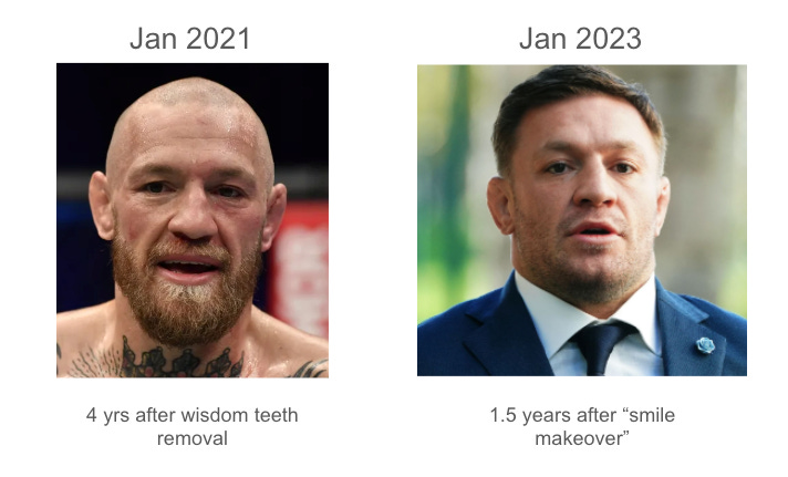 事情是這樣的:2021 年 4 月,也就是他第二次對上 Dustin Poirier 的比賽前幾個月,Conor 進行了一次笑容改造。