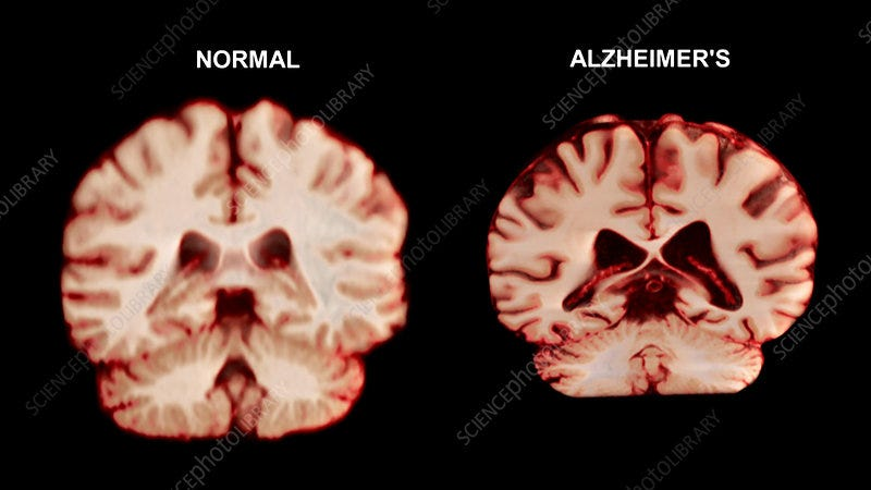 最近我們社群裡有人分享了一張非常有趣的對比圖:左邊是健康人的大腦,右邊是阿茲海默症患者的大腦。這張圖片讓我大開眼界,也頓時想到:如果如我所說的「氣球理論」,頭顱塌陷擠壓大腦,那麼大腦體積真的會變小,這事實上也的確存在。科學界早就注意到了這個現象:數十年來的研究發現,患有神經系統疾病或心理疾病的人,在影像檢查中常常呈現大腦體積減少的樣子。一般醫學界都把這歸因於疾病本身,但要是情況剛好相反呢?要是大腦本身變小被壓迫,才是真正造成這些問題的根源呢?