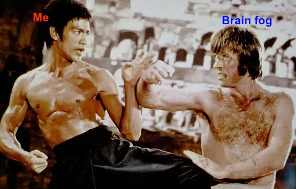 所以,儘管案例不多,到目前為止我對抗腦霧的戰績是三戰三勝:我自己和測試組的兩位成員都成功擊退了腦霧。因此,基於這樣的紀錄,在有人能證明我錯之前……我相信只要運用這套絕妙又生猛的生物力學,沒有誰的腦霧是消除不了的。