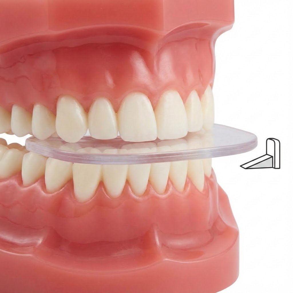 了解這個口腔護具的運作方式非常重要。我們認為它能改善 Spee 曲線,這往往會產生一個暫時性的輕微後牙開咬。因此,你需要持續佩戴護齒套,直到牙齒自然伸長來閉合這個開咬的縫隙,這可能需要數年時間。