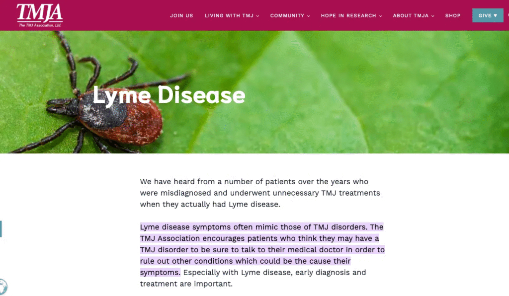 有趣的是,有研究顯示顳顎關節(TMJ)問題與萊姆病之間具有高度相關性。事實上,許多萊姆病患者其實被誤診為 TMJ 的例子並不少見(在一些 TMJ 資訊網站上也提到了這點)。
