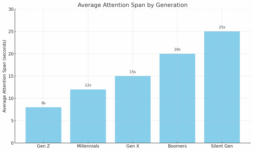 看看上面的數據——隨著不同世代的演進,不同世代的人維持專注的時間越來越短。醫學界的人百思不得其解,只好說:「可能是現在社群媒體讓人類較容易注意力缺失」或者「一定是基因的關係」。但你用常理想想看……