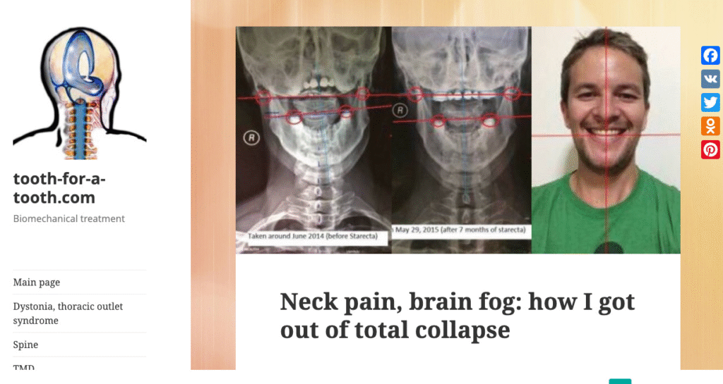 早在 2023 年春天,我偶然發現一個名為 tooth-for-tooth 的網站,裡面討論了 Starecta 以及其他治療顳顎關節問題的方法。我也看到了 Ken(Reviv 創辦人)的故事。雖然當時我對 Starecta 以及網站上提到的一些方法很感興趣,但終究還是不敢嘗試。
