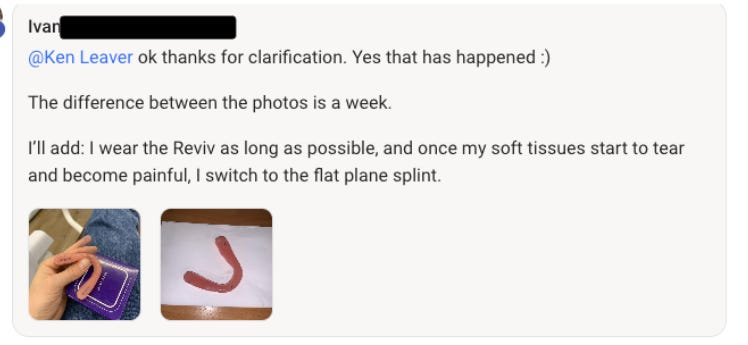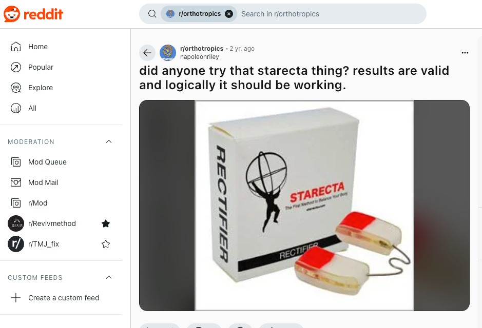 接著我在 Reddit 論壇上看到一則帖子,有人提出了關於 Starecta 的疑問。一位回覆此帖的用戶,描述自己的經歷時讓我聯想到 tooth-for-tooth 網站上寫的 Ken 的故事。而這位用戶在回覆中建議樓主可以嘗試 Myobrace A1 作為替代方案。