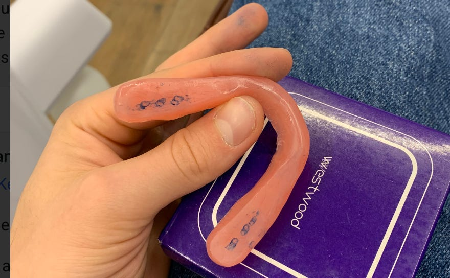 Ivan 拿到了牙醫為他製作的平面咬合板。這個咬合板是裝在他下排牙齒上的,並經過調整,使得左右兩側最後面的兩顆臼齒都能均勻接觸到咬合板。(下圖為 Ivan 的平面咬合板實物照片,可以看到後牙留下的均勻接觸痕跡。)