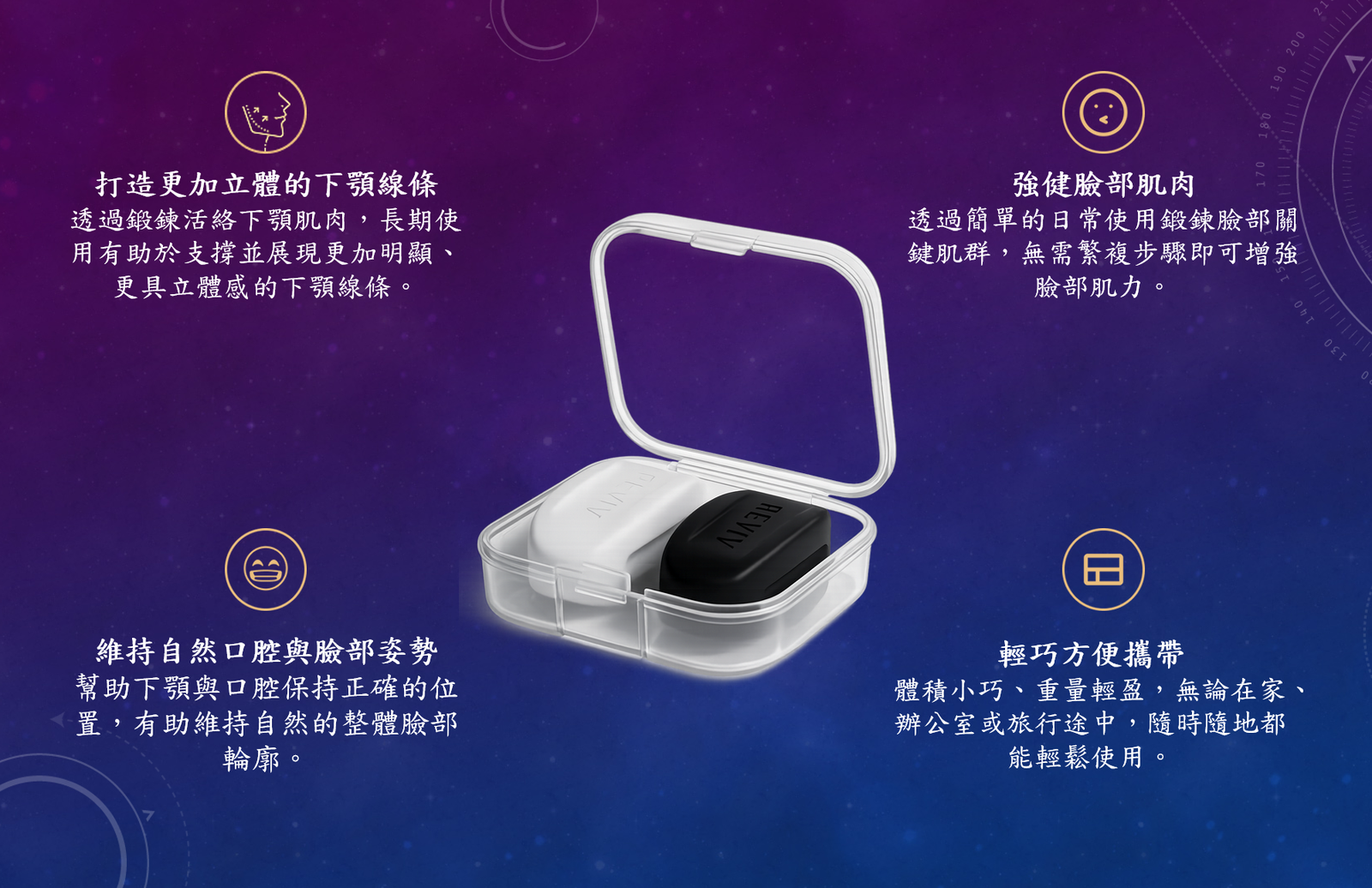 透過鍛鍊活絡下顎肌肉,長期使用有助於支撐並展現更加明顯、更具立體感的下顎線條。