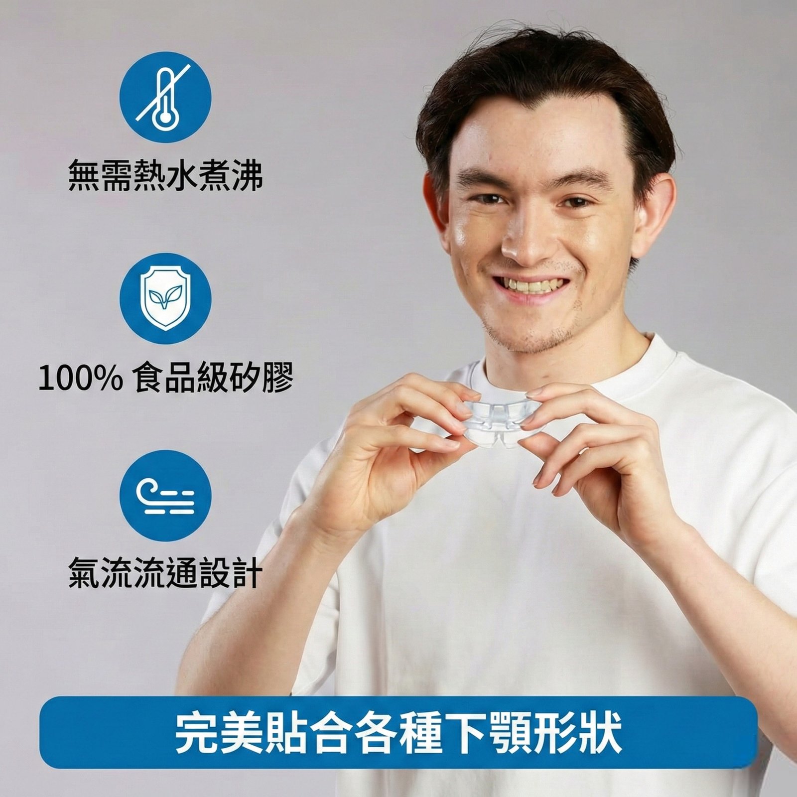 「我戴這個口腔護具才 3 週,下顎的疼痛就完全消失了!現在我做下巴內收的運動時,頸部肌肉也不再痙攣抽筋。」——Jay