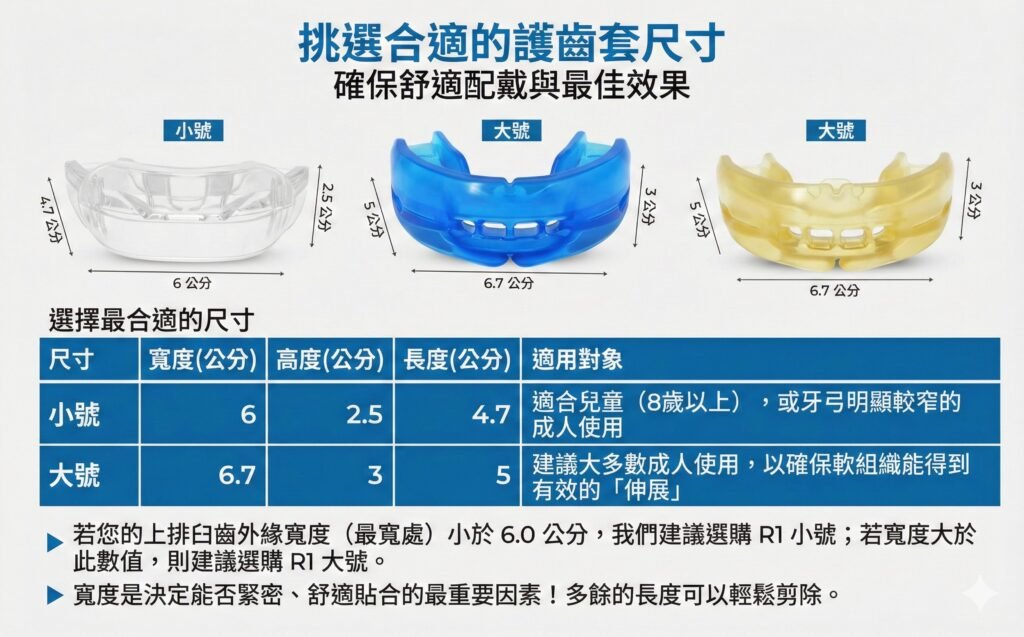 ○ 如果你的上顎寬度小於 6.0 cm,建議選擇 R1 小號;若寬度大於此數值,建議選擇 R1 大號。