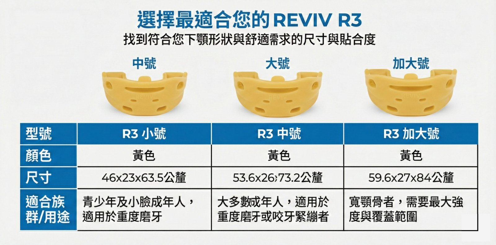○ 如果你的上顎寬度小於 63.5 mm,建議選擇 R3 中號;若寬度大於此數值,建議選擇 R3 大號。至於新增的加大號(XL),主要是為了口腔較大的成人以及那些口腔結構已經明顯擴展、希望在原本Reviv的基礎上繼續往前延展的使用者所設計。
