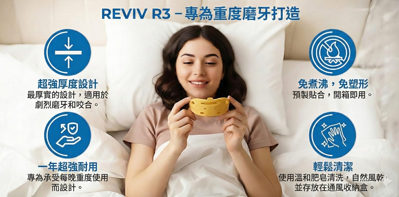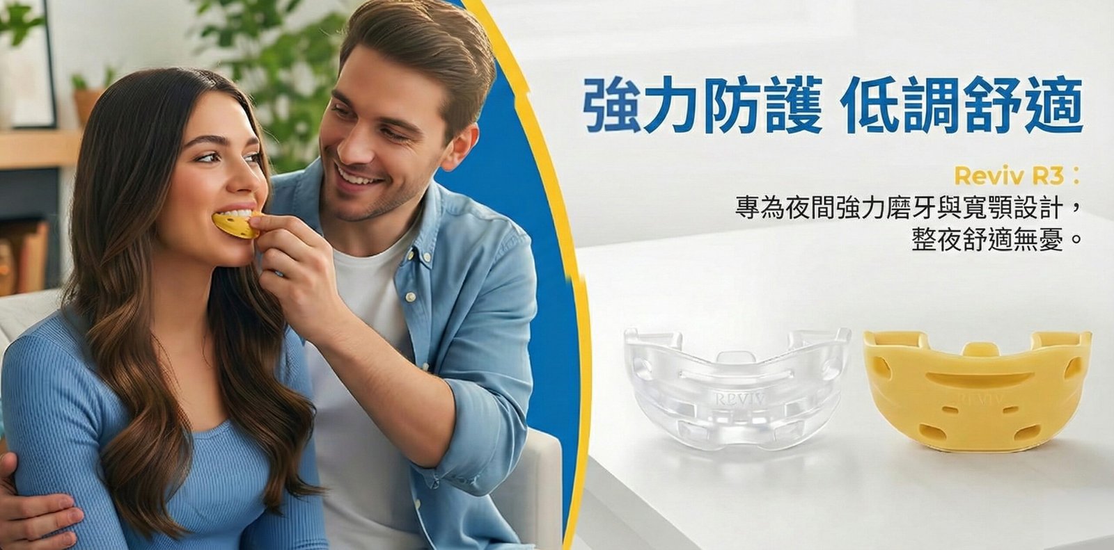 Reviv 護齒套會在您睡覺時於牙齒之間形成一道保護層,降低咬緊牙關與磨牙的影響;這些行為可能導致牙齒磨耗並讓下顎肌肉更緊繃。改善這些因素後,許多使用者回饋更舒適,整體生活品質也有所提升。