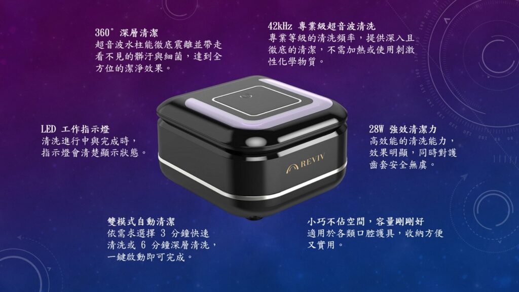 - 讓你在短短幾分鐘內,就能以更潔淨、更安心、更聰明的方式,維持 Reviv 口腔護具的最佳狀態。