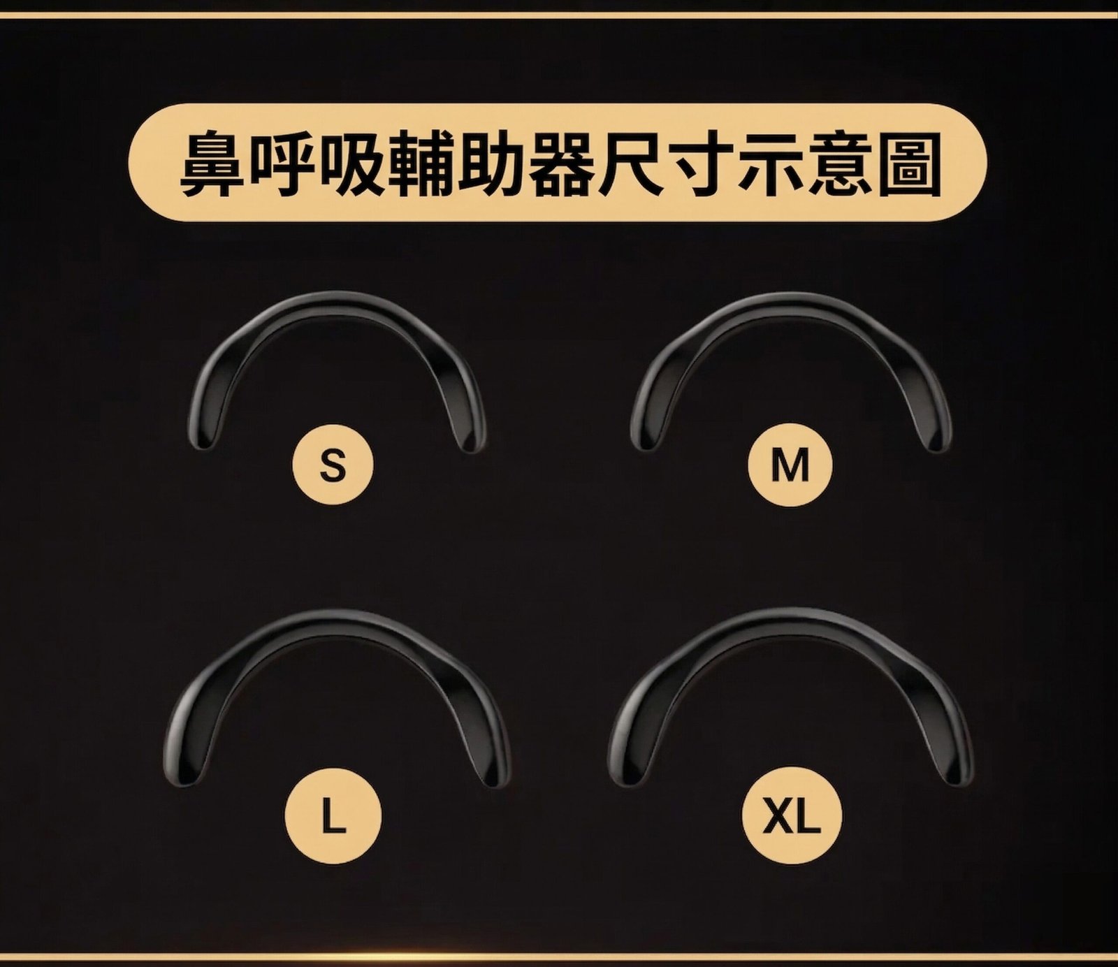 本產品內含 4 種尺寸的彈性固定帶(S / M / L / XL),可依個人鼻型選擇最合適的尺寸,提供穩定貼合與舒適配戴體驗,協助維持自然順暢的鼻呼吸感受。