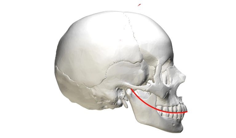 Spee 曲線就是你在上圖中看到的那條弧線,它代表著上下排牙齒互相接觸時形成的那條連線。在一個顱骨和口腔健康的人身上,你會看到如上圖所示那樣漂亮自然的弧度。隨著視線往口腔後方移動,牙齒接觸點的位置就會越來越高,形成一條向上的曲線。